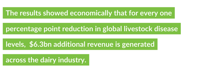 And for every 1% reduction in dairy cattle disease rates, there would be an increase in production enough to meet the average dairy needs of 80.5 million people and increase producer revenue by $6.3bn. Current dairy production losses due to disease are approximately 180 billion kg, equal to the annual consumption needs of 2 billion people.