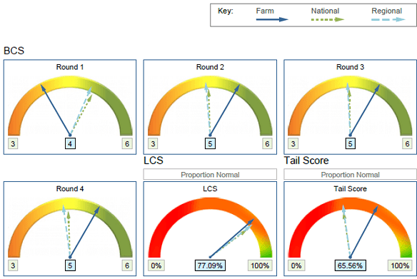 The dials are colour coded and arrows populate on the dial to show where the farm sits compared to the regional and national benchmarks for each metric.